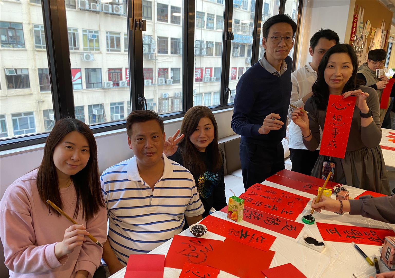起居室里洋溢着笑脸和友好的交谈声。 团队参与了传统手工艺活动,如写福字和剪纸,展示出他们的才华,并表达对新年的美好期望。 大家都享受着社会企业TimeToGold提供的美味蒸年糕和手工传统麻糬。